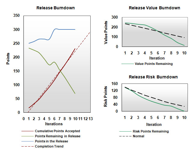 These metrics also provide a release burn-down that enables the team to track progress against the release goal starting from the third iteration via a release burn-down. Separate burn-downs are calculated for scope, risk and value delivered.