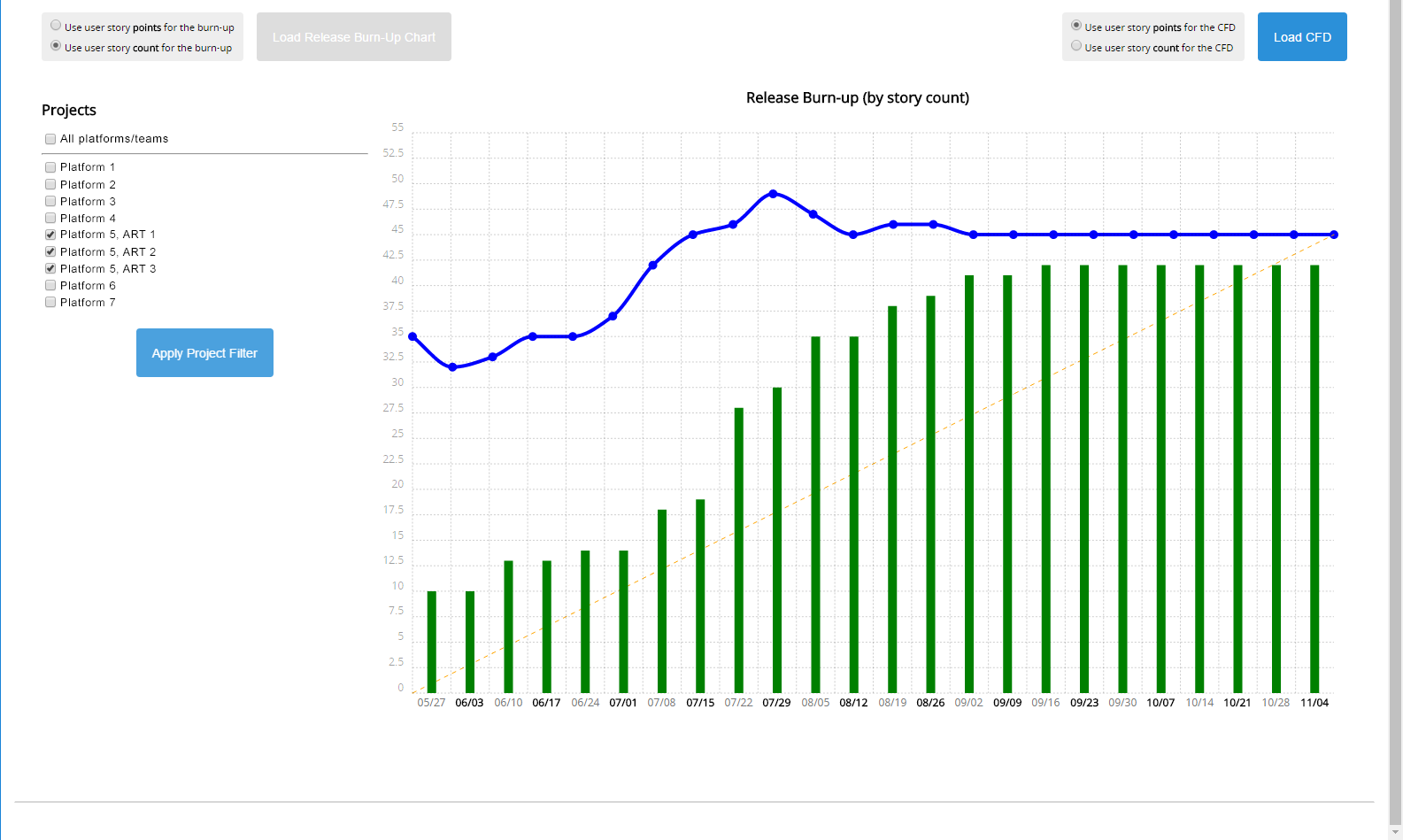 - A complete release burn up chart for work both internal and external to your organization using story points or story count